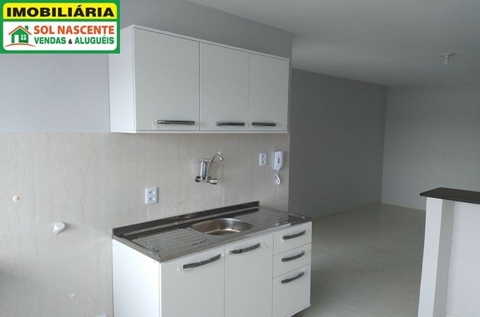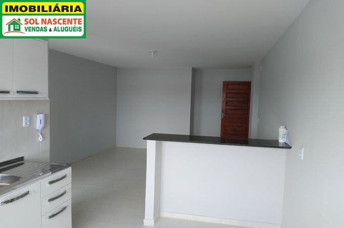 Imóvel com sala, suíte com ampla varanda, cozinha americana com armários e área de serviço.