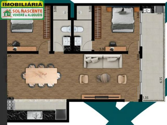 Com área privativa de 73,42m², 2 quartos, sendo 1 suíte, sala com 2 ambientes, cozinha americana, área de serviço, banheiro social e 1 vaga de garagem.